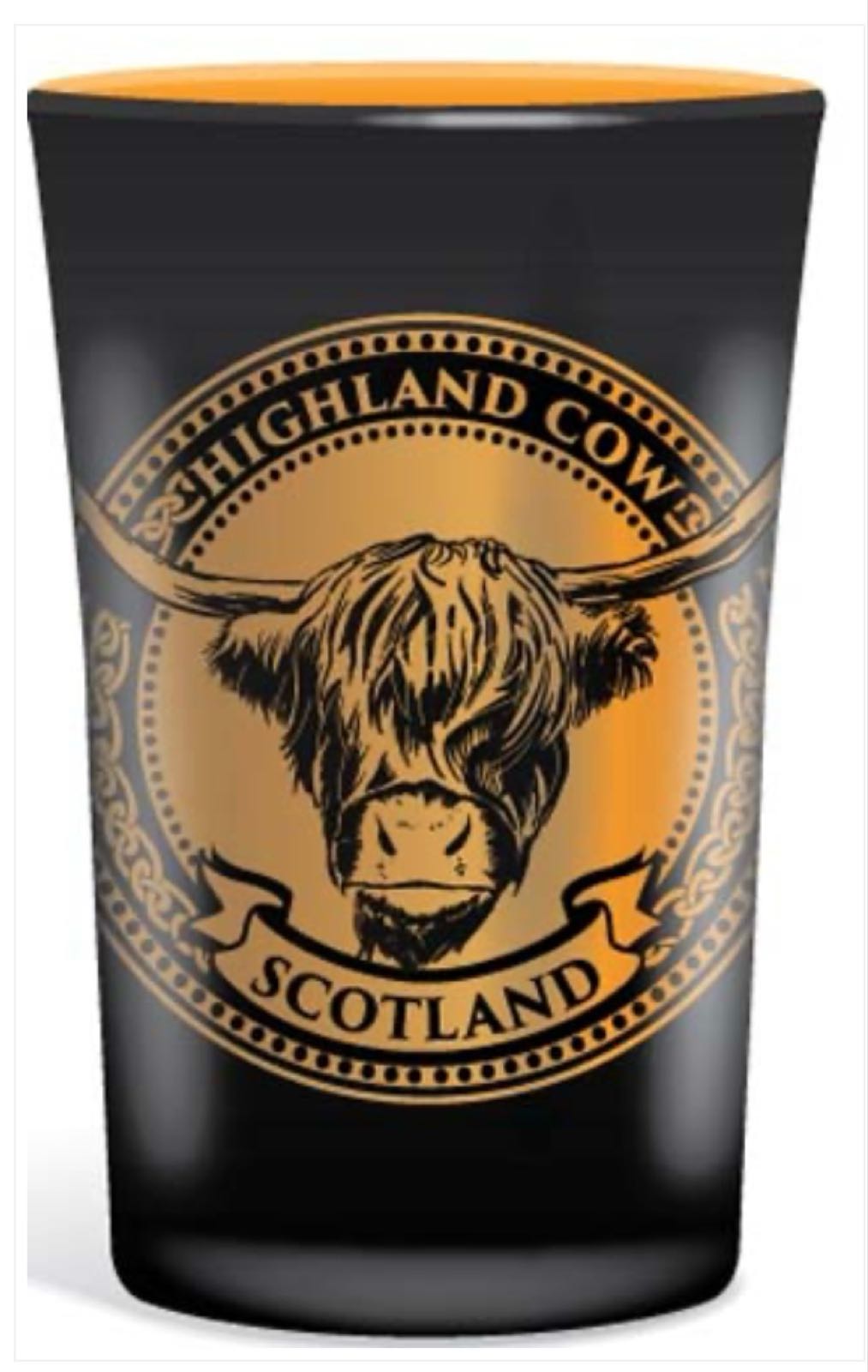 A glass shot glass with a Scottish highland cow on the front, the picture doesn’t do it justice, the metallic gold colour inside is stunning!