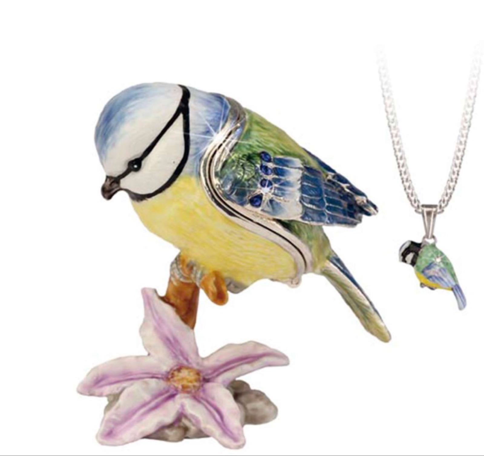 A gorgeous trinket box with a teeny wee bluetit on a necklace as a surprise gift inside.