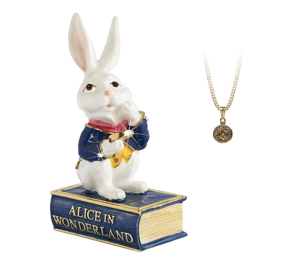 a beautiful enamelled trinket box featuring the white rabbit from Alice in wonderland. inside is a wee surprise, a necklace with a “drink me” bottle charm on. these come in their own special gift box.